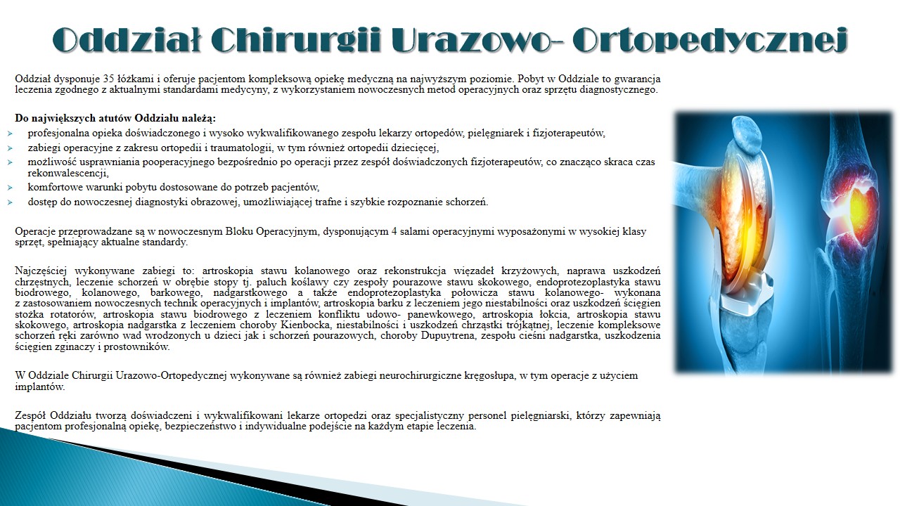Lekarze Ortopedzi przyjmują również w Poradni Ortopedycznej, znajdującej się w tutejszym szpitalu. W Poradni odbywa się m.in. kwalifikacja pacjentów do zabiegów planowych, wykonywane jest USG bioderek u dzieci, zmiana opatrunków. Wszystkim pacjentom gwarantujemy profesjonalną opiekę lekarską i pielęgniarską oraz miły pobyt. Oferujemy również możliwość kontynuacji leczenia w Oddziale Rehabilitacyjnym naszego szpitala.
